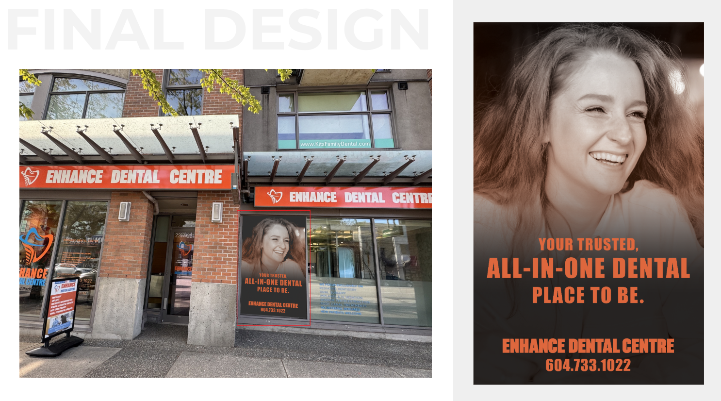Original designs for the window vinyl focused on the copy, and included imagery provided by Enhance Dental. After some edits, the client expressed a preference for centered orange text and a simple logomark instead of a full logo inclusion. The final design uses grayscale stock imagery to convey friendliness and healthy smiles, and orange text for simplicity, keeping the text bold to ensure legibility on the vinyl material. The final design is both cost-effective for the firm and eye-catching to the audience.