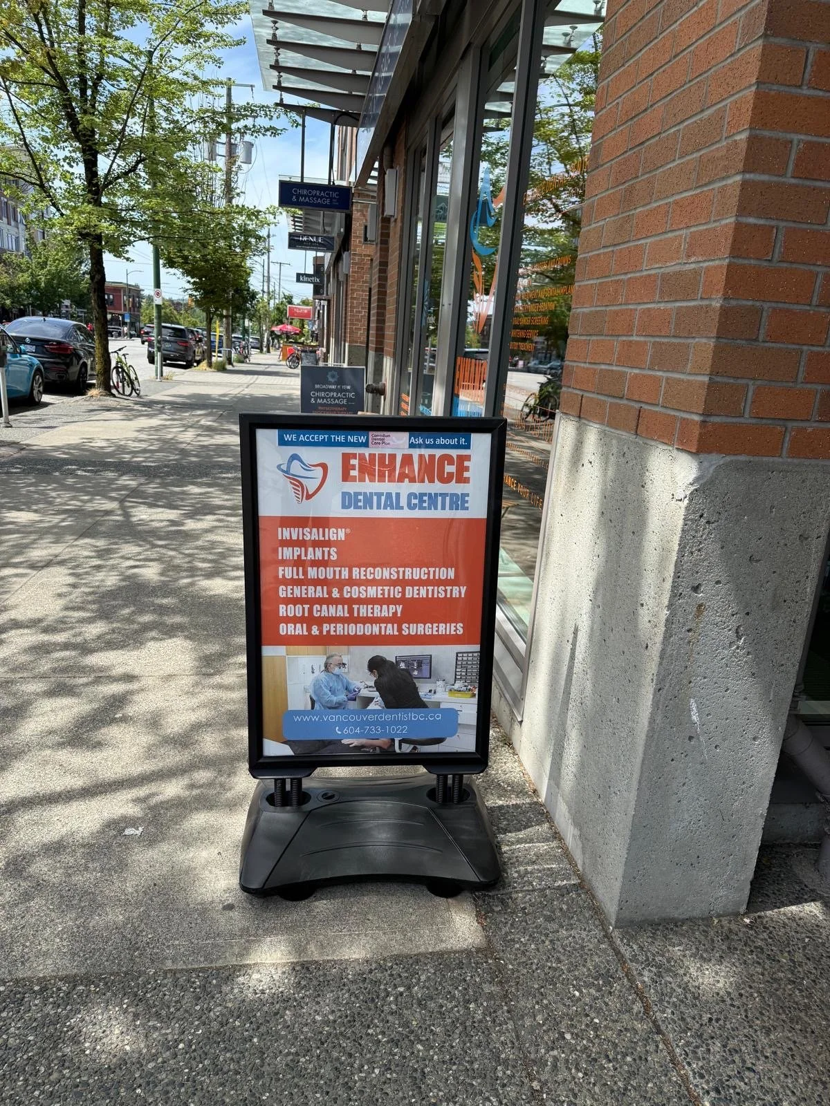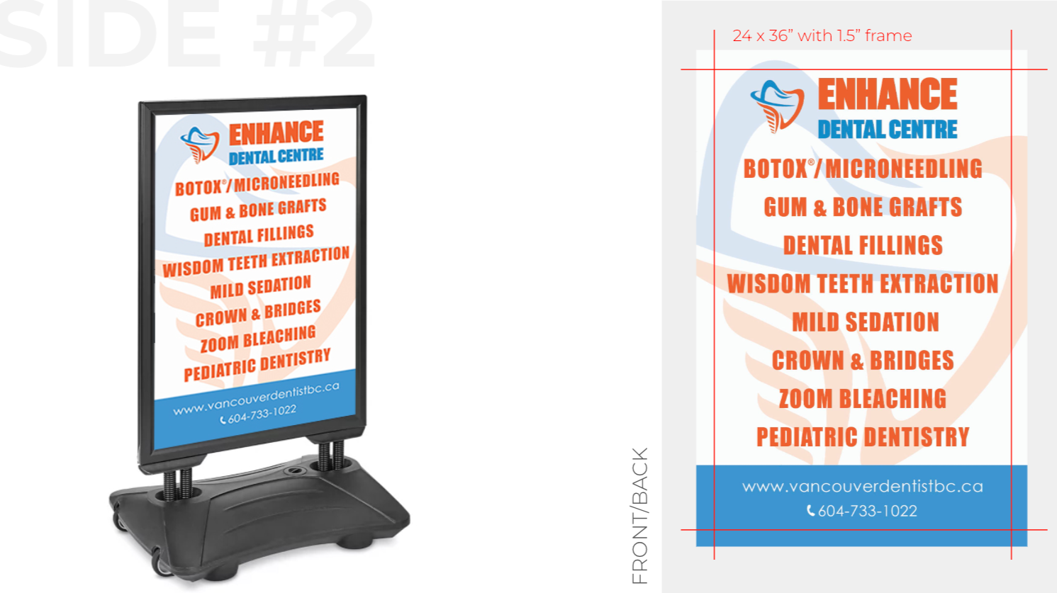 Sandwich board design includes front and back sides listing services offered by the practice, along with contact information for passersby.